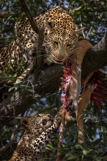 The two Leopards were still at the kill site busy finishing off the kill when we got into the sighting, but photographing them was nearly impossible for the most part due to the many distracting branches. But every once in a while we would have an opening to capture a few shots of the cub as she looked towards her mother as she was busy feeding.